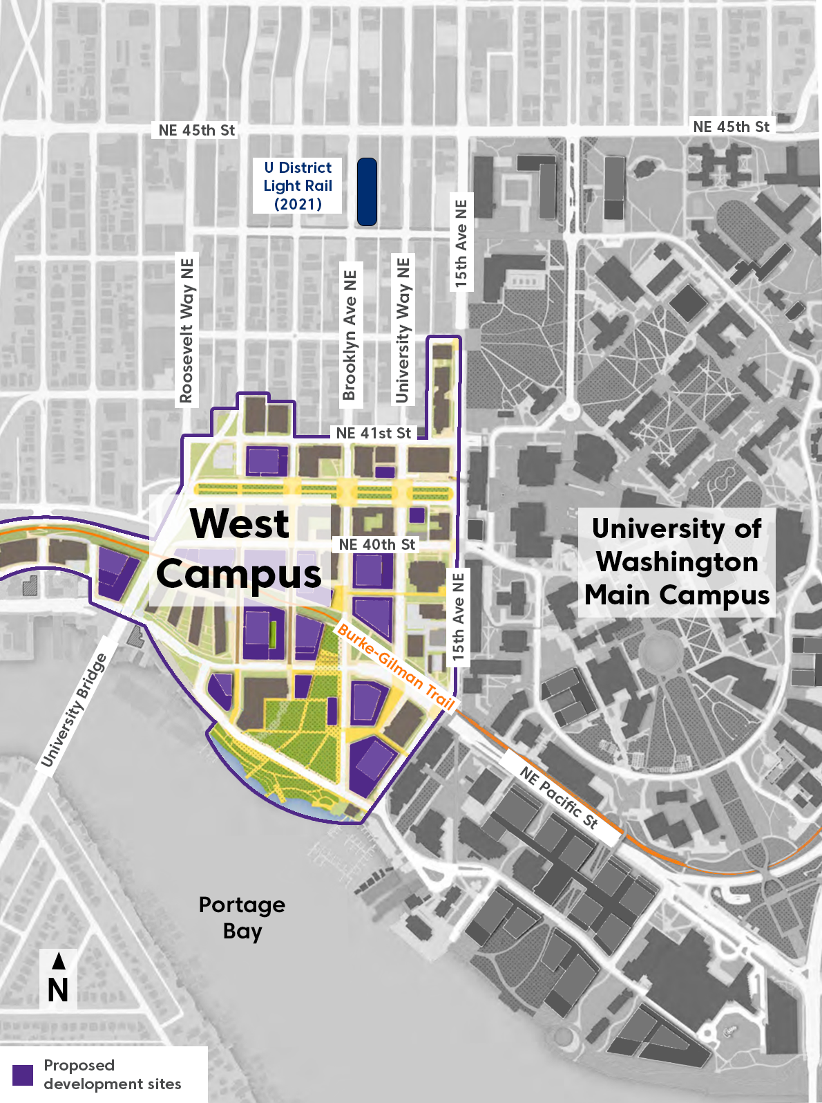 UW’s West Campus is located just south of the forthcoming U District Link Light Rail Station and within short walking distance of greenspace and the Portage Bay waterfront.